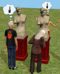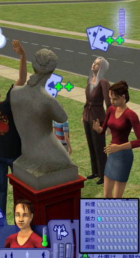 Commitしてセーブ。ゲームに入れて確かめます。シムは石像に話しかけて、カリスマスキルをアップさせます。