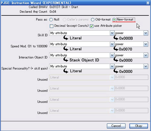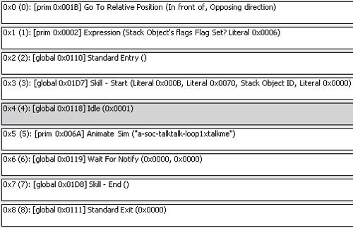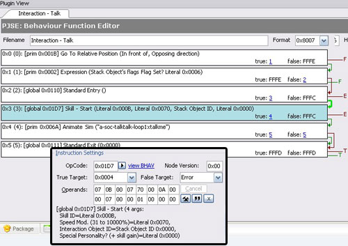 例えば「Skill - Start」の場合。どのスキルを上げるのか、どれくらいのスピードでスキルポイントが貯まるのか、シムがスキルを鍛えるのにどのオブジェクトを使っているのか、シムの性格よるボーナスは付くのか(例:社交が高いとカリスマスキルの学習にボーナスが付く)という事を決めるパラメーターが必要になります。呼び出されたこのBHAVは、パラメーターを与えられることによってはじめて具体化され、パラメータに基づいて動作することが出来るようになります。この辺りの事は「Data Types for Simantics Users」に書いてあるそうです。