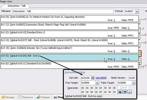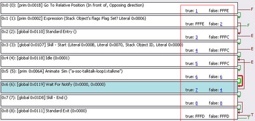 先ほどStandard entryとexitについて設定をしましたが、スキルアップの行動も同じようにstart とendが存在します。まずはBHAVのどの時点でスキルアップを開始させるかですが、Standard Entryの後、Animate Simの前にします。新しいBHAVのBoxをこの位置に入れて、Globalの" Skill - Start "(Opcode:0x1D7)を設定します。これはパラメーターを必要とするコマンドです。