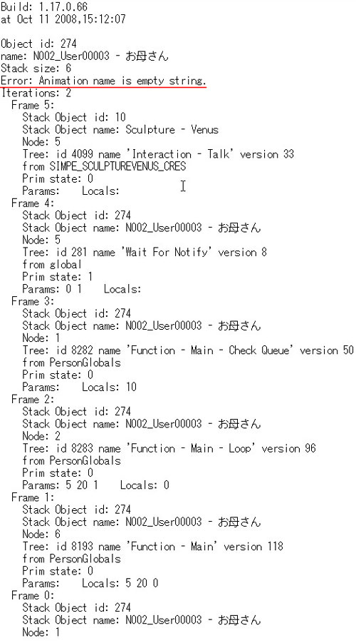 「チュートリアルの画像と同じにBHAVを作ったのにーー!!?」とびっくりしすぎて、エラーが出た時のSSをとり忘れました。エラーが表示されたら、とりあえずResetを選択してセーブせずにゲームを終了し、作成されたログを見てみました。
