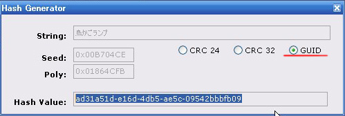 Hash Generatorの小ウィンドウが開いたら、「GUID」のラジオボタンをクリック。